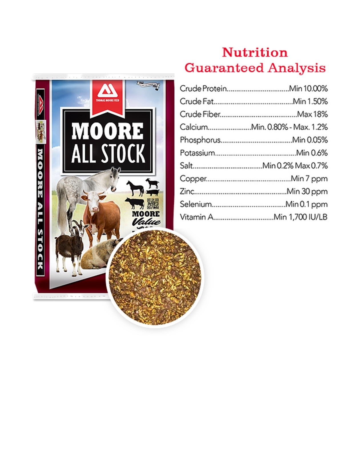 Thomas Moore's 10% Sweet Textured All Stock Feed 50# offers 10% all-natural protein and contains flaked corn. Enhanced with the Moore Vitamin & Mineral Package, it meets the dietary requirements of various species. This feed is a cost-effective source of well-rounded nutrition. Guaranteed Analysis includes: at least 10.00% Crude Protein, 1.50% Crude Fat, up to 18% Crude Fiber, Calcium between 0.80% and 1.2%, minimum 0.05% Phosphorus, minimum 0.6% Potassium, Salt ranging from 0.2% to 0.7%, minimum 7 ppm Copper, minimum 30 ppm Zinc, minimum 0.1 ppm Selenium, and a minimum of 1,700 IU/LB Vitamin A.