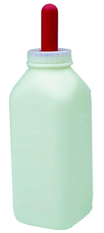The sanitary way to feed calves and lambs. 2 quart capacity bottle, made of strong and durable polyethylene plastic. Nipples are made from a special rubber formula to prolong life and improve pliability. Features screw on cap and nipple with vacuum air vent.