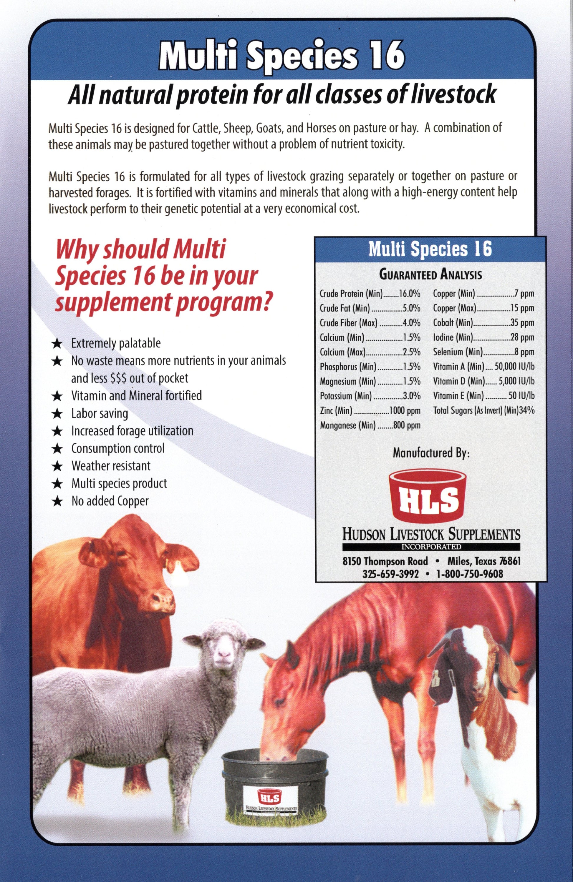 Multi Species 16 is designed for Cattle, Sheep, and Goats on pasture or hay. A combination of these animals may be pastured together without a problem of nutrient toxicity.