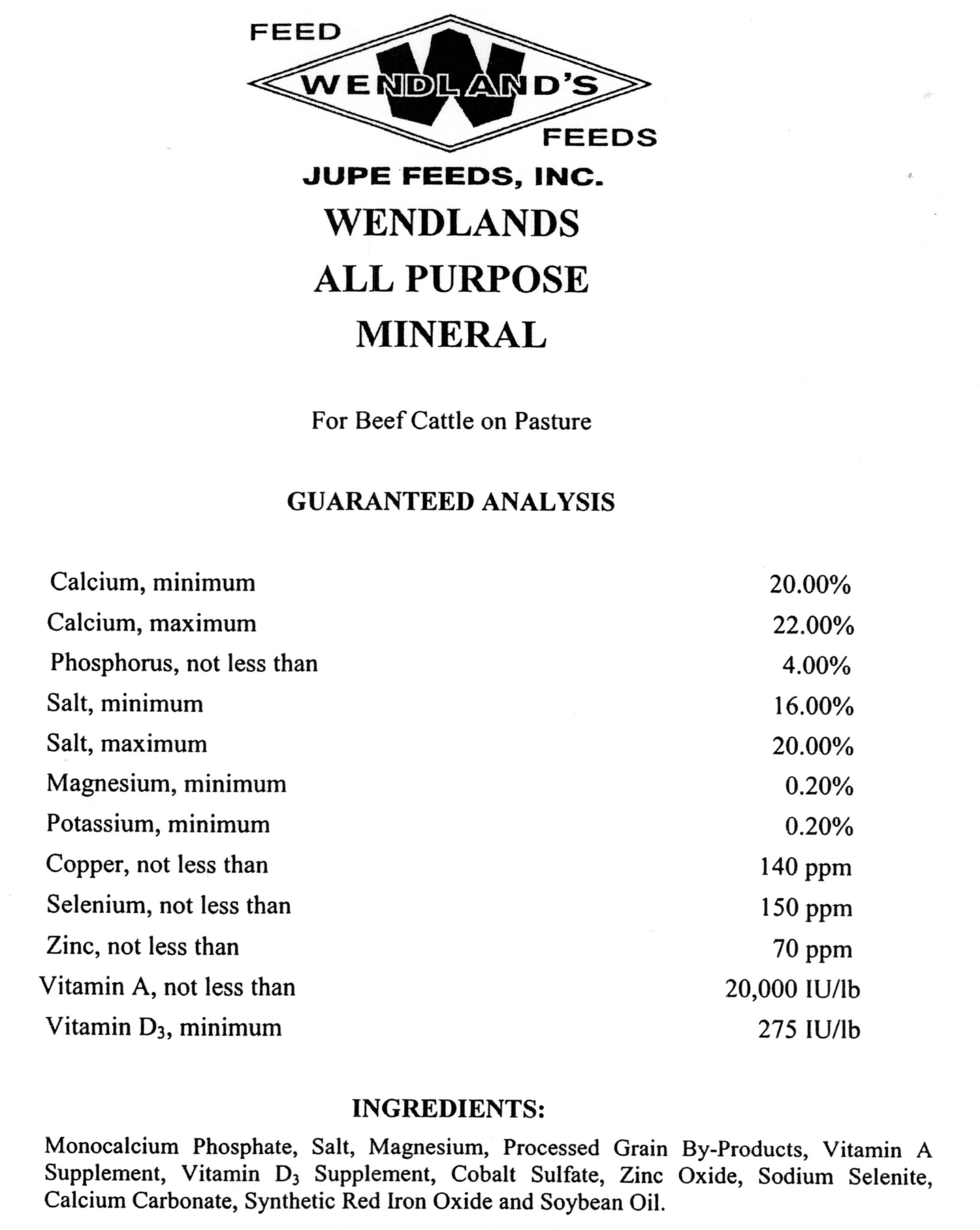 Wendland's Mineral All-Purpose Loose 50# feed is designed to be offered free choice to cattle grazing on range or pasture.