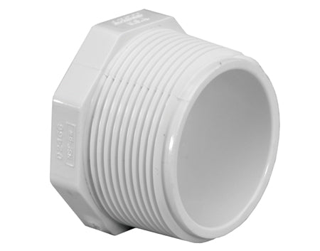 1-1/2 inch Schedule 40 White PVC Male Threaded Plug with iron pipe threads. Adapts to standard female pipe threads. Teflon or PTFE thread tape is recommended for threaded joints. Used in sprinkler & irrigation systems. Conforms to ASTM D2466.