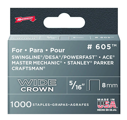 600™ Staples Flat Crown – Crown Width: ½” (12 mm). For use in: Swingline 800, 800x, 900, 1000 and 34201 Electric, Master Mechanic Models 174839, 345025 and 136150 Electric, Sear's Craftsman Models Heavy Duty, Parker Models TR70, TR75, TR 80 and TRE100 Electric, and Ace Hardware Models 22084 and 22087 Electric.