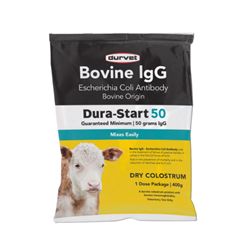Dura-Start 50 (Bovine lgG - Escherichia Coli Antibody) aids in the treatment of failure of passive transfer in calves in the first 24 hours of birth. Aids in the prevention of mortality and in the reduction of diarrhea due to E.coli.