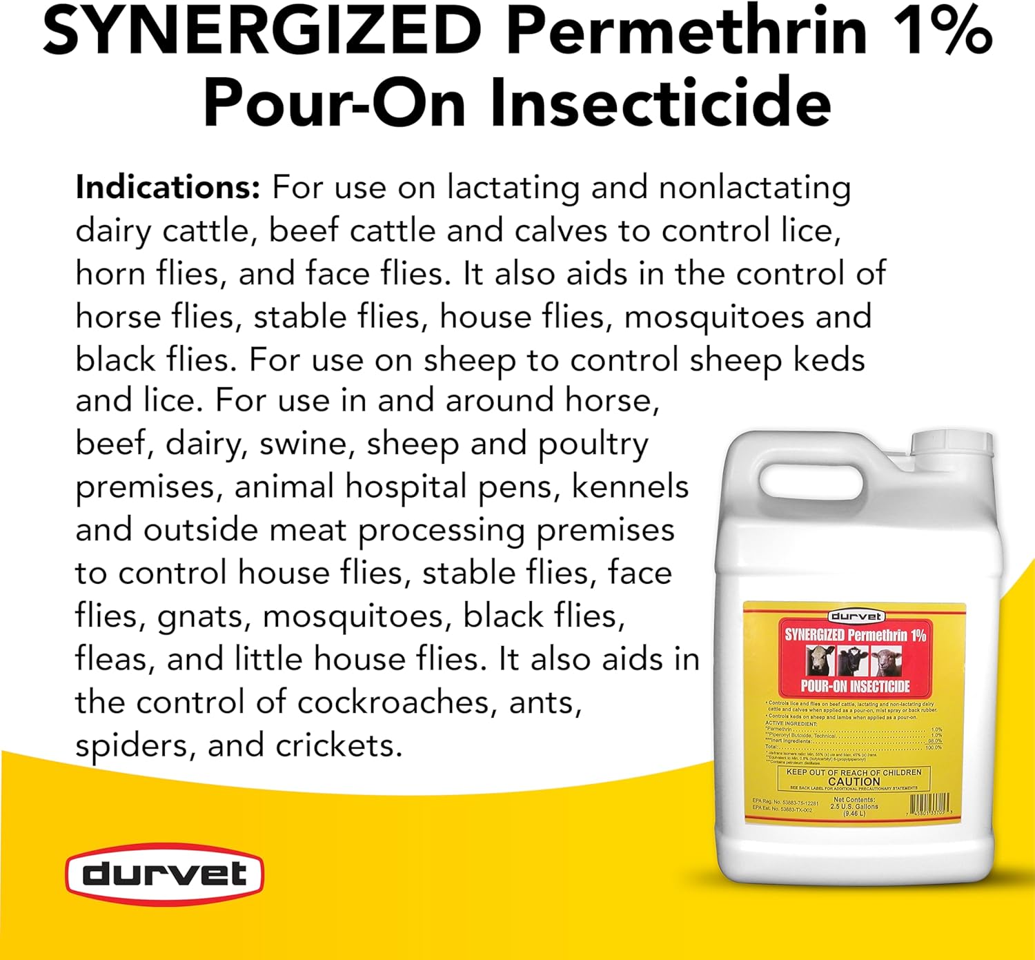 Durvet Fly Synergized Permethrin 1% is a ready-to-use, broad-spectrum insecticide designed for livestock and farm premises. Formulated with 1.0% Permethrin and 1.0% Piperonyl Butoxide Technical, it effectively controls lice, horn flies, and face flies on lactating and nonlactating dairy cattle, beef cattle, and calves. It also aids in controlling horse flies, stable flies, house flies, mosquitoes, and black flies on livestock. For sheep, it controls sheep keds and lice. Use in and around horse, beef, dairy, swine, sheep, and poultry premises, animal hospital pens, kennels, and meat processing areas to control house flies, stable flies, face flies, gnats, mosquitoes, black flies, fleas, and little house flies. It also helps manage cockroaches, ants, spiders, and crickets. The oil-based formula allows application year-round in any weather. Choose between convenient pour-on or spray-on application methods. Economical and effective for comprehensive farm insect management.
