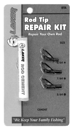 Laker Rod Tip Repair Kit with glue-black. 3 rod tips per pkg. 1 each sizes: 6/64, 7/64, 8/64.
