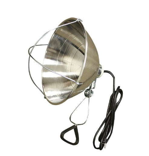 Provides chicks with a warm, dry environment. Heat-resistant ceramic socket and double wire bulb guard for safety. Features 6-foot electrical cord with polarized male prongs and scratch-resistant clamp with ball joint for easy positioning. Corrosion-resistant 10.5" aluminum shade has a built-in hanger. Uses 300 watt bulb maximum, sold separately.