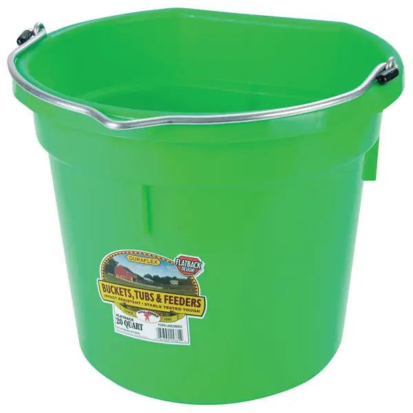 Flat back buckets have always been a favorite around the farm. The flat side fits more compactly against a wall or fence and makes hauling heavy loads of water or feed a lot easier. Molded from tough, polyethylene resin that is impact resistant, protects against warpage, and helps prevent stress cracks. Feature heavy-duty steel eyelets and handles.