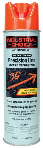 Create ultra-crisp, long-lasting marks with RUST-OLEUM INDUSTRIAL CHOICE? (r) M1600 system precision line inverted marking paint spray. This solvent-based formula creates accurate, easy-to-read markings in bright, durable colors. Use for marking concrete, pavement, gravel, grass, and more. Use to mark the location of underground utilities at construction and excavation sites where identification is desired. Features a precision-line spray tip for easy-to-read, bright, vivid markin gs. Can be applied down to 25-degree Fahrenhiet. Dries in less than 5 minutes. Spray-through cap. Tip keeps paint off fingers. Use with sku#826.4608. Can be used in USDA facilities based on FSIS Directive 11,000.4 (Rev. 1), November 24, 1995. Covers appro ximately 600-700 linear feet at 1 in. wide.