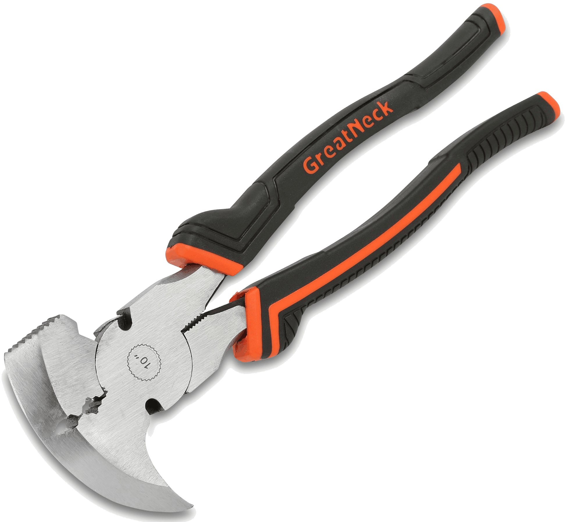 Useful for work on wooden and steel posts on the ranch or farm. Starting and pulling point on one jaw with corrugated hammer head on the other. Front pulls staples, lifts lugs and splices wires. Wire stretcher located behind joint. Handles are coated with green plastic. 10"