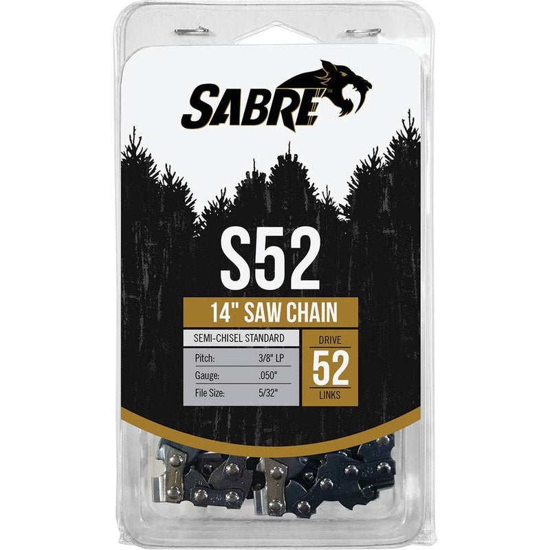 Bar Length 14" Chainsaw Gauge .050" Chainsaw Pitch 3/8" LP Drive Links 52 File Size 5/32" Packaging type Branded clam shell Type Semi-Chisel Standard