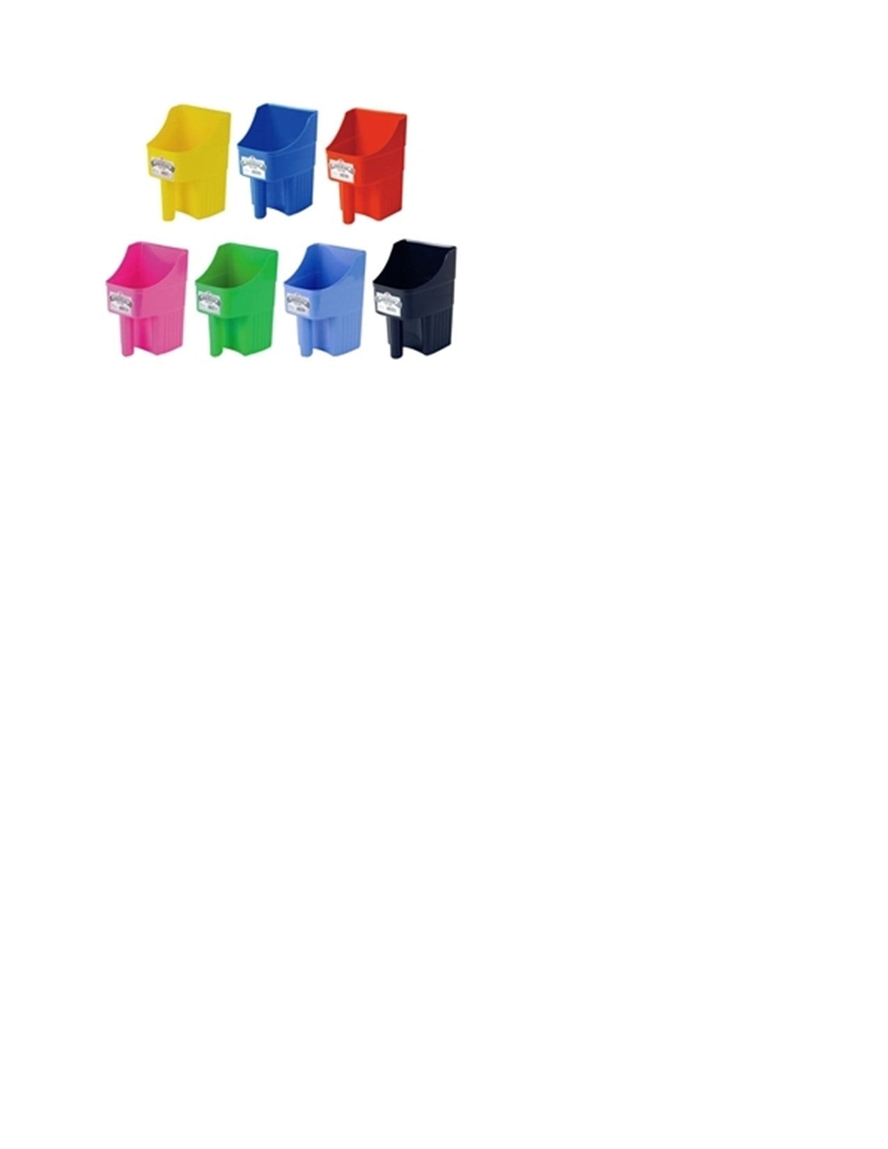 The best all-around scoop you'll ever use. Enclosed design reduces spillage, and measuring is easy with built-in graduation marks which are perfect for feed, supplements, and seed. The flat bottom allows you to set the scoop down without tipping over and makes the scoops stackable for storage. Ample 3-quart size made of heavy-duty polypropylene for long life. Available in multiple colors to mix and match. 6.25-inch-long by 6-inch-wide by 9.25-inch-high.