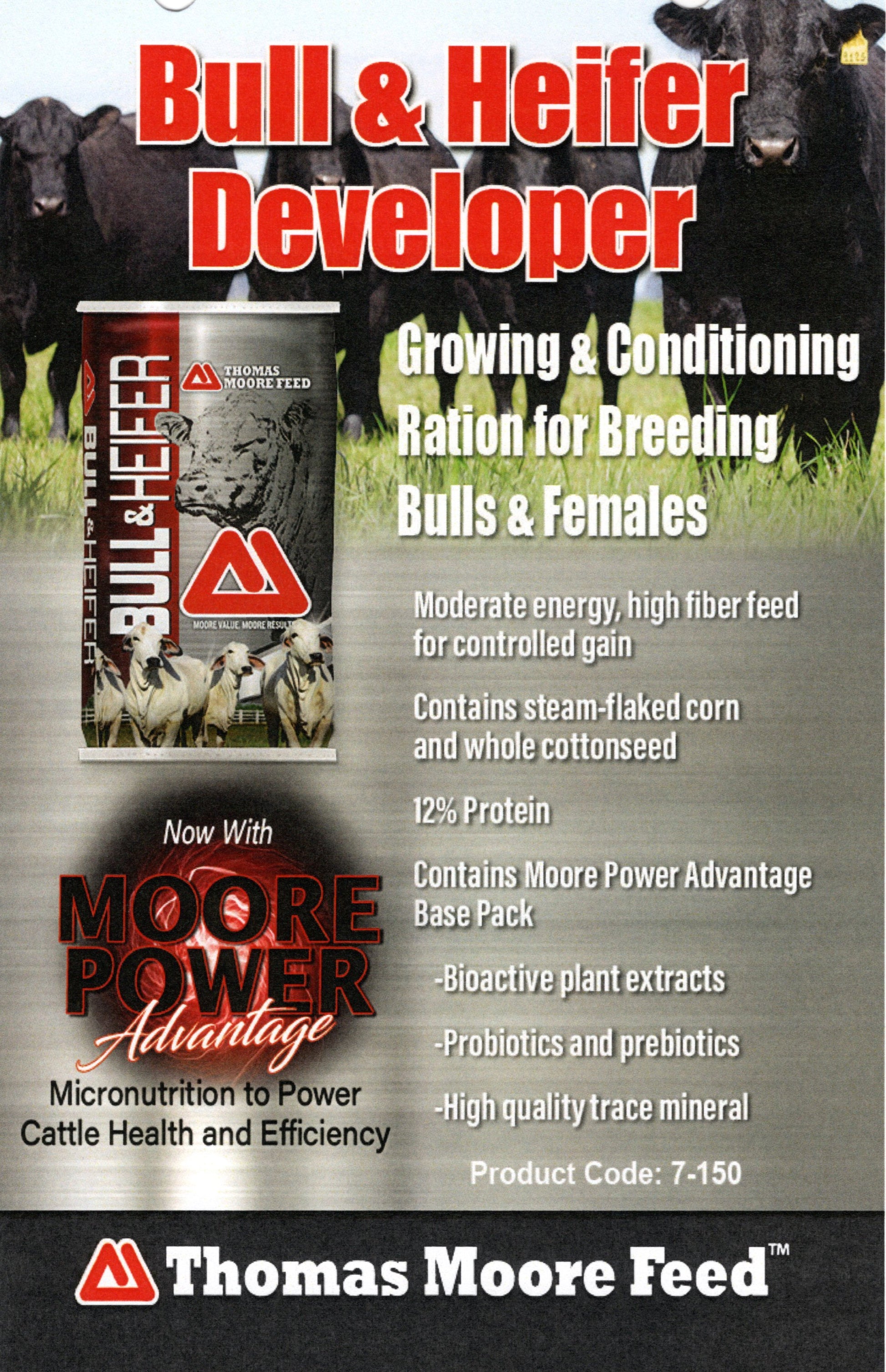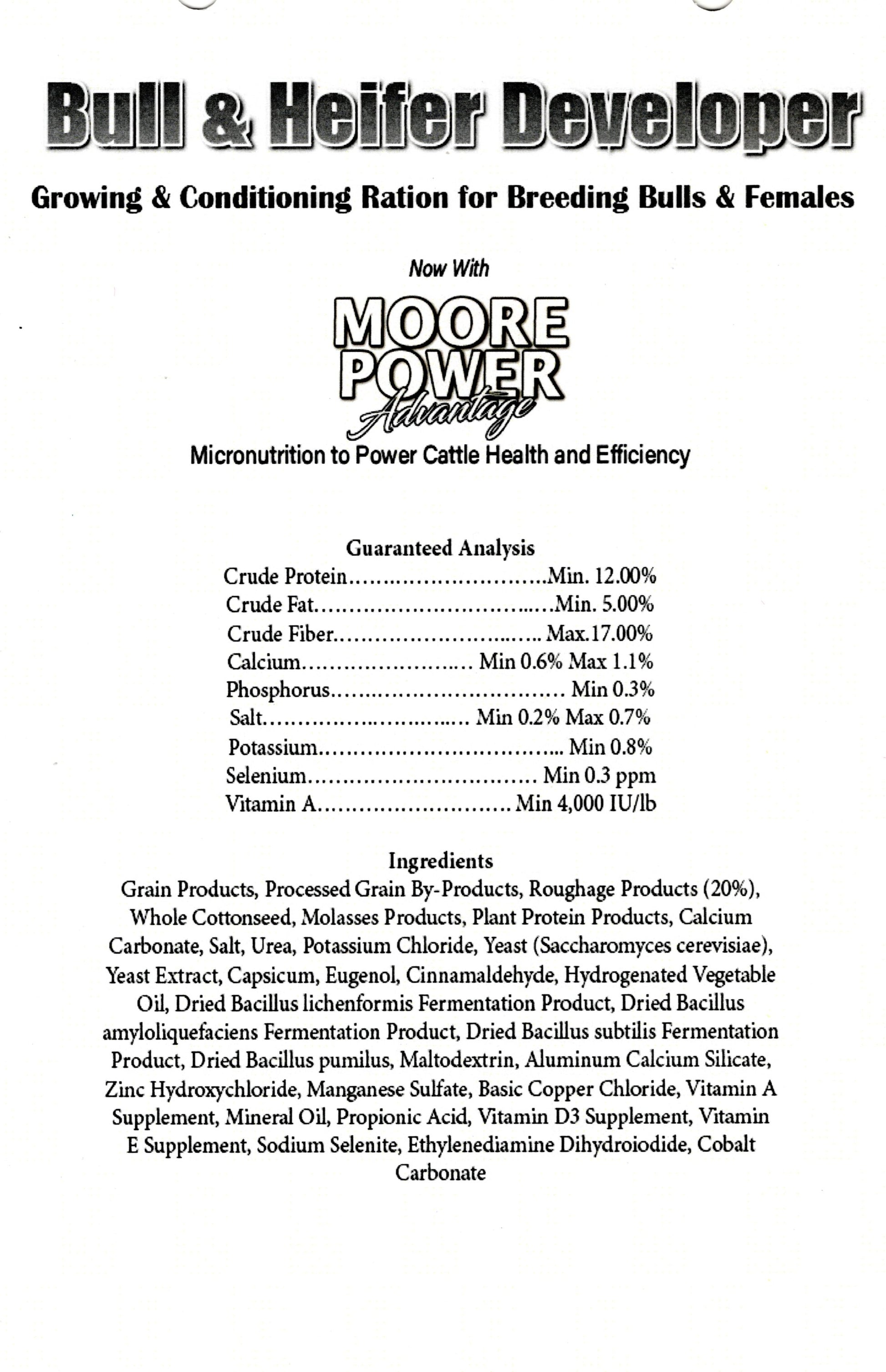 BULL HEIFER DEVELOPER 12% TEXTURED is designed for young bulls and heifers, offering a 12% protein complete feed that requires minimal additional forage. Featuring flaked corn and fortified with the Moore Vitamin & Mineral Package, this high-quality textured ration supports growth and conditioning for breeding bulls and females. Suitable for various feeding programs, it helps enhance body condition year-round. This palatable feed promotes healthy intake and overall well-being, providing a reliable and cost-effective nutritional solution.