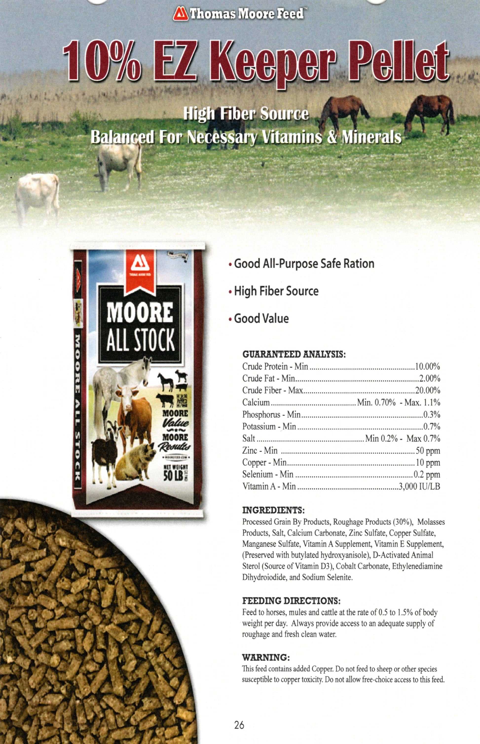 10% EASY KEEPER PELLETS ALL STOCK 50# - THOMAS MOORE offers a reliable, safe feed solution suitable for cattle in pasture or feedlot, as well as for adult horses and mules. This high-fiber ration is carefully formulated with the Moore vitamin and mineral package to provide a well-rounded balance of essential nutrients for maintaining health and condition.