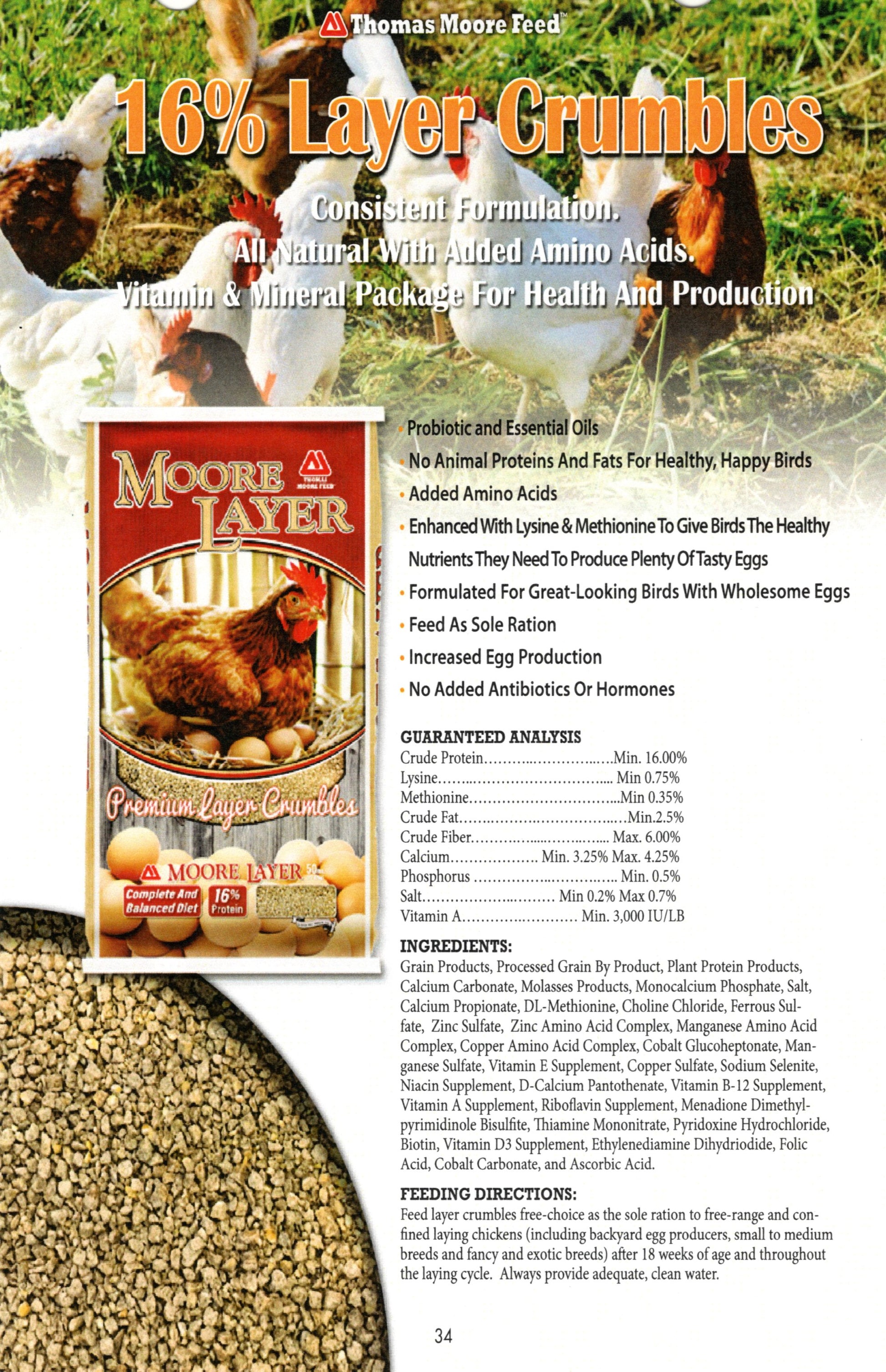 LAYER PREMIUM CRUMBLES POULTRY #50-THOMAS MOORE FEED is expertly designed to meet the nutritional needs of both egg-laying poultry and mature, non-laying birds. With a carefully balanced 16% protein content, this feed supports sustained energy levels and muscle maintenance. Its consistent formulation ensures reliable nutrition batch after batch, while the inclusion of all-natural ingredients promotes overall bird health without artificial additives. Added amino acids further enhance protein quality and support vital physiological functions. Fortified with the comprehensive Moore Vitamin and Mineral Package, this feed helps maintain strong immune defenses, optimal bone development, and sustained egg production, making it an ideal choice for maximizing flock performance.