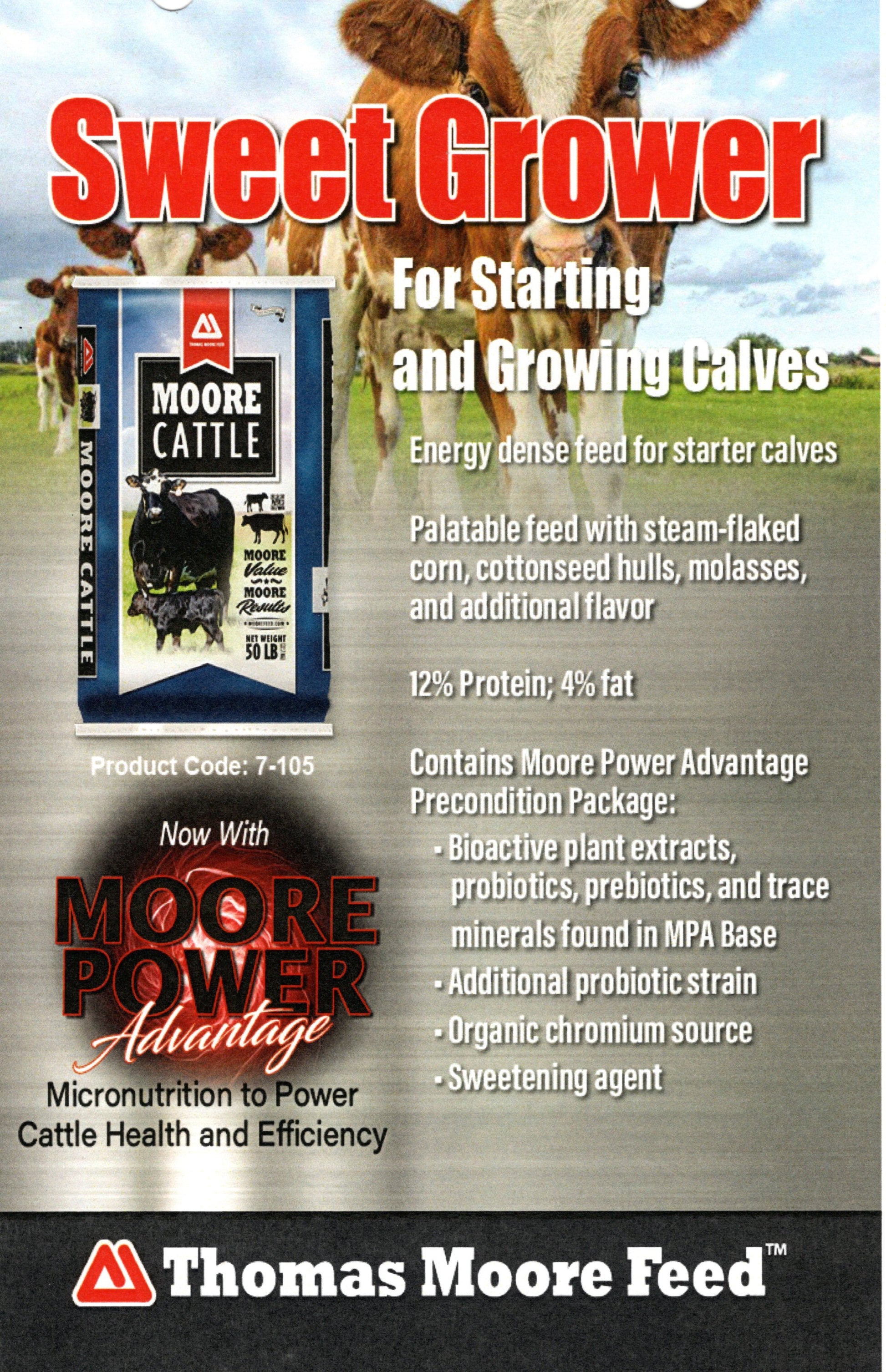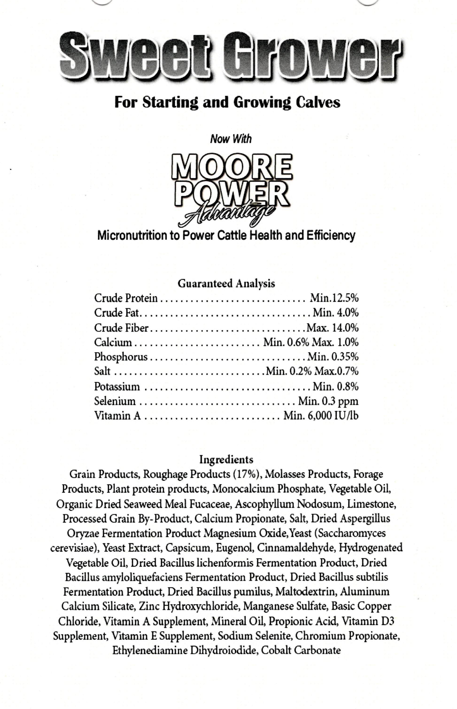 SWEET GROWER CATTLE 12%-TEXTURED 50# - THOMAS MOORE FEED This energy-rich textured sweet feed is formulated for starter calves, combining steam-flaked corn, cottonseed hulls, molasses, and other ingredients for enhanced palatability. Delivering 12.5% protein and 4% fat, it includes the Moore vitamin and mineral formula plus the Moore Power Advantage Precondition Package. This package features bioactive plant extracts, probiotics, prebiotics, trace minerals, an additional probiotic strain, an organic chromium source, and a natural sweetener to support optimal growth and health in young cattle with minimal need for extra forage.