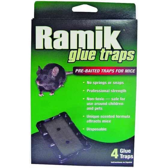 Mouse traps glue trays Pre-baited trap for mice. No springs or snaps. Disposable. Non toxic. Safe to use around children and pets. Unique scented formula attracts mice. Contains 4 glue boards.